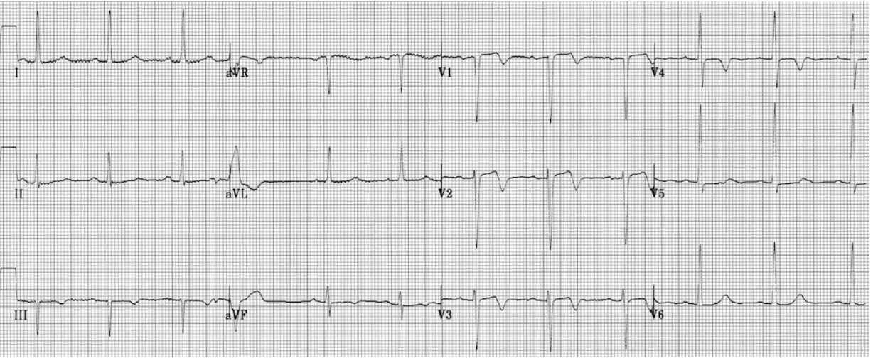 Widespread ST depression (V3-6, I, II, III, aVF)