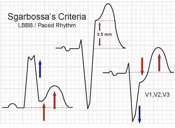 With LBBB or ventricular paced rhythm infarct can be difficult. - –Concordant ST elevation > 1mm in leads with a positive QRS complex (score 5)