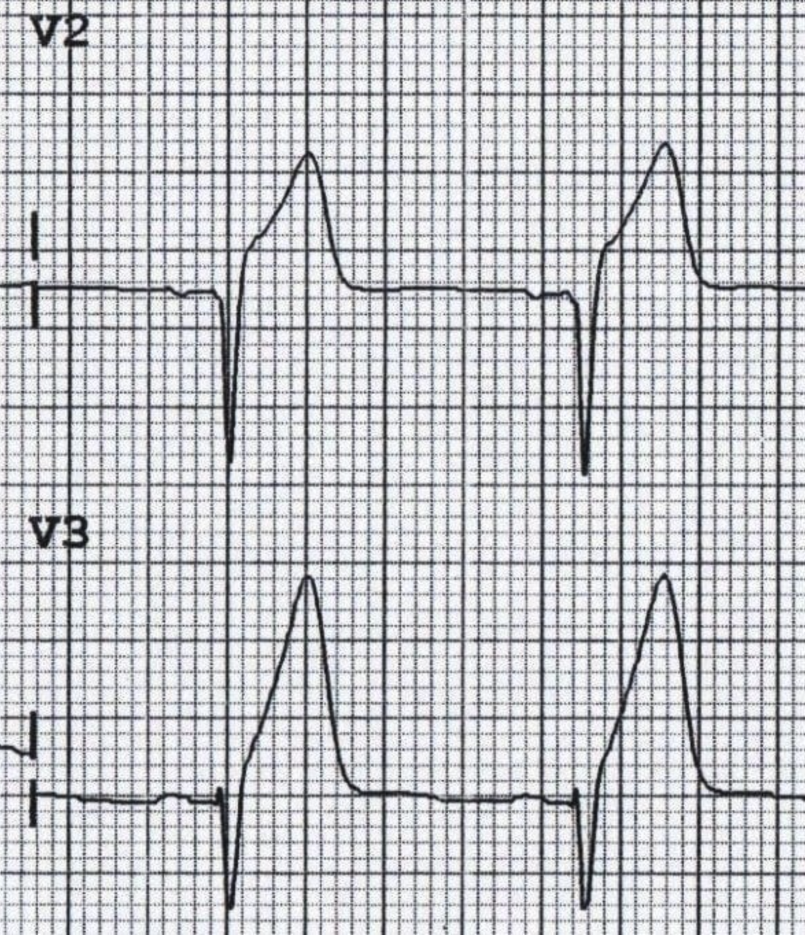 ST depression in V1-V3; tall R waves and upright T waves in V2-V3
