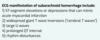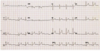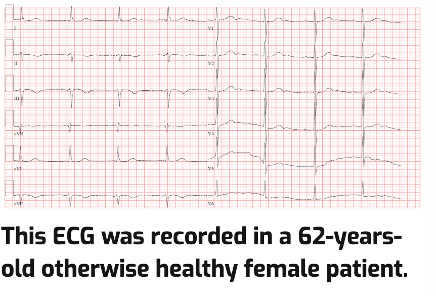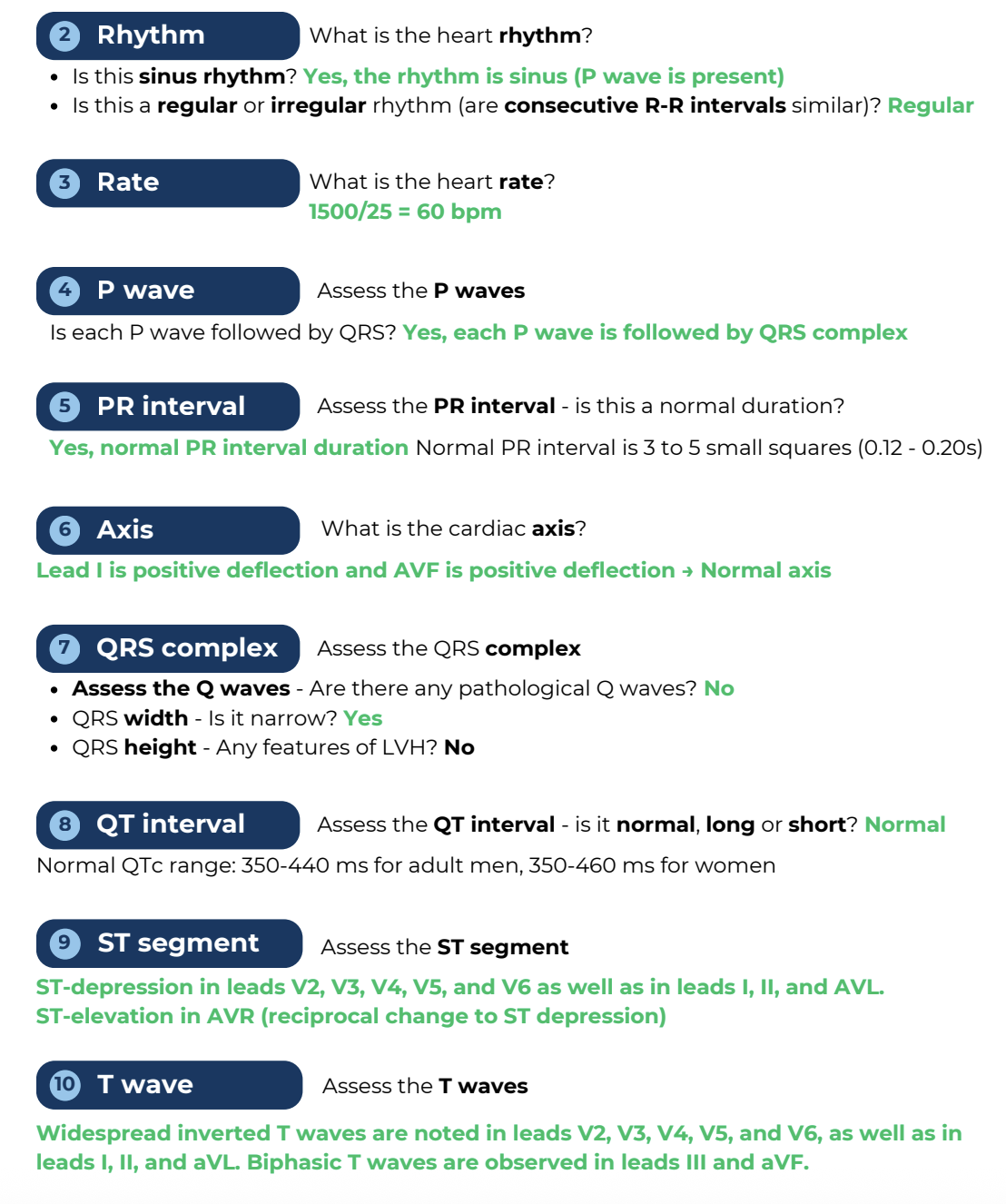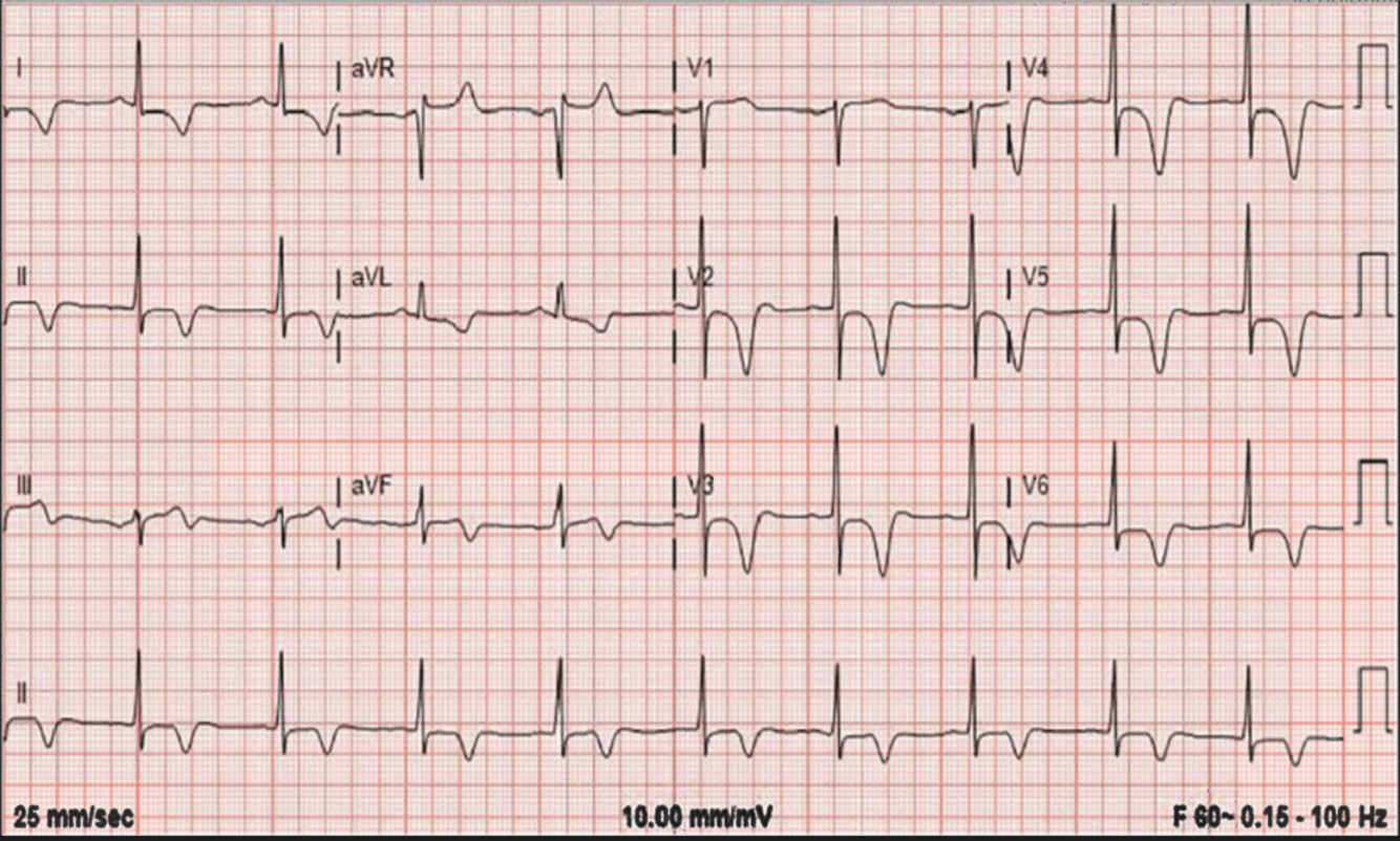 ST depression in leads V2, V3, V4, V5 and V6 as well as in leads I, II and aVL