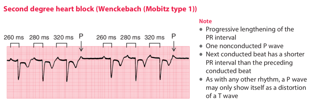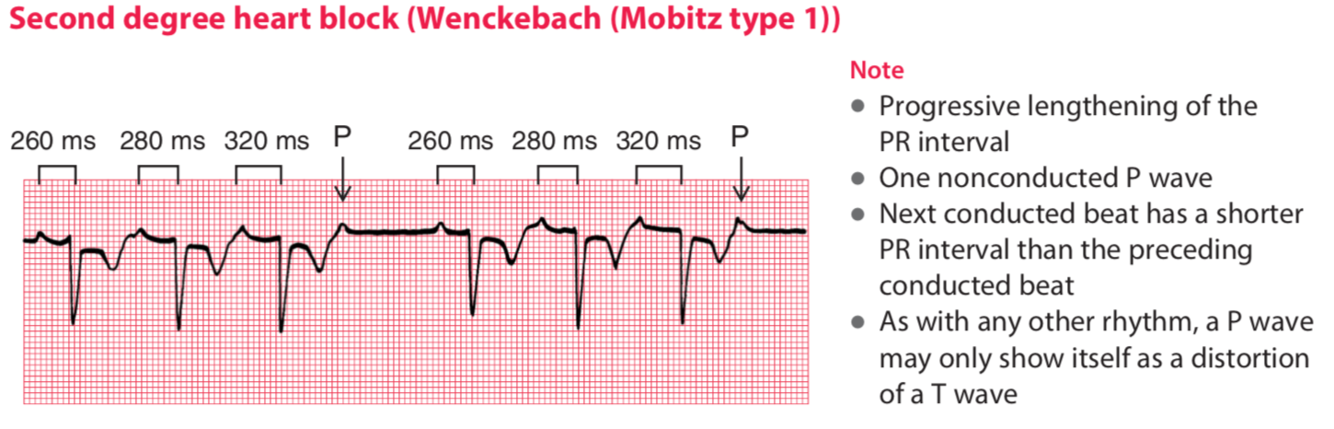 How do you identify 2nd degree heart block (Mobitz type 1/Wenkelback) on an ECG?