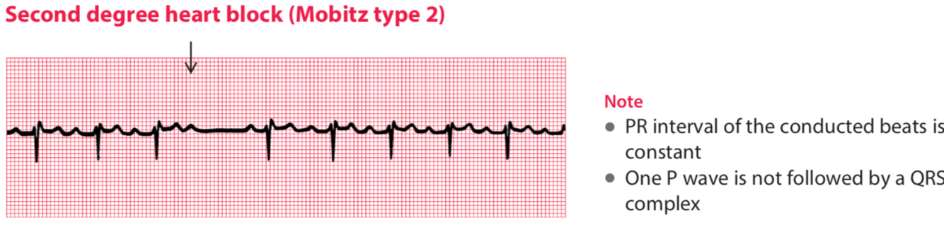 What is 2nd degree heart block (Mobtiz type 2) w.r.t. to electrical conduction?
