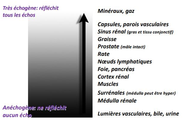 Définir les structures échographiés d’anéchogène à très échogène
