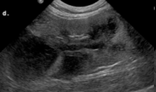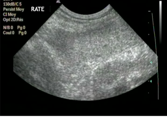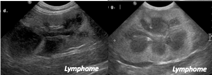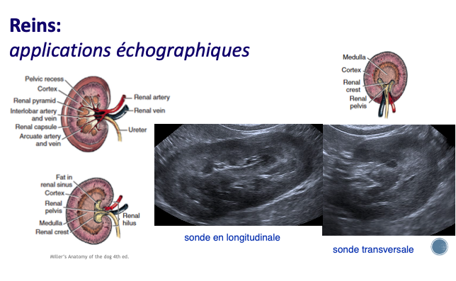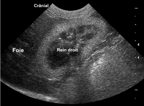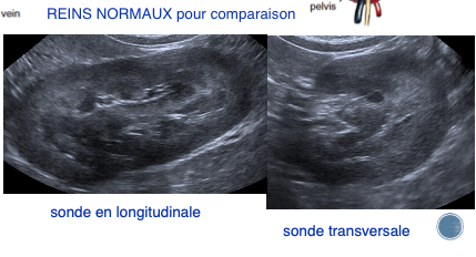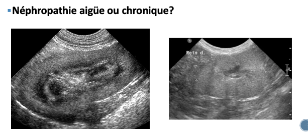 à D : le rein est + petit qu’à G + contours bosselés, irréguliers => chronique. Épaississement du cortex rénal avec hyperéchogénicité du cortex => signe de néphropathie chronique.