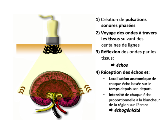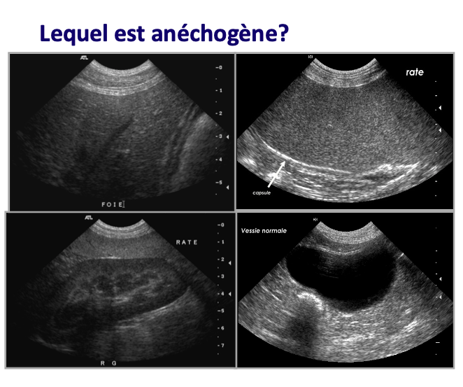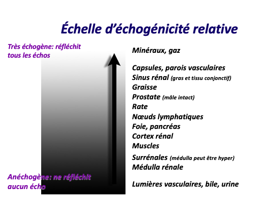 Décrire l’échelle d’échogénicité (du plus échogène au plus anéchogène).