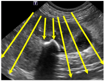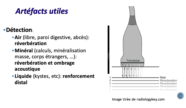 => région anéchogène (cône d’ombre) distale à une surface hautement atténuante (minérale)