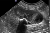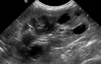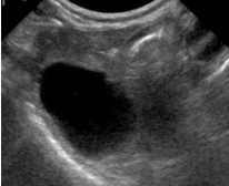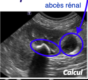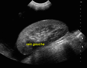 énorme structure anéchogène => bassinet extrêmement dilaté de liquide => hydronéphrose (obstruction urétérale)