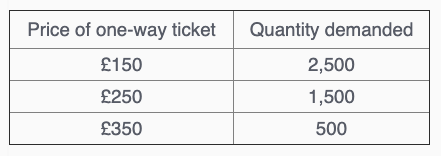 Suppose that the table below shows the daily demand for high-speed train tickets from London to Paris. As the price increases from £250 to £350, what is the price elasticity of demand?