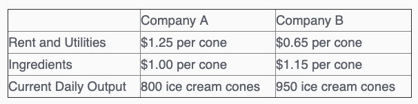 The table below shows fixed and variable costs per-unit for an ice cream shop, “Company A,” and its local competitor, “Company B”.