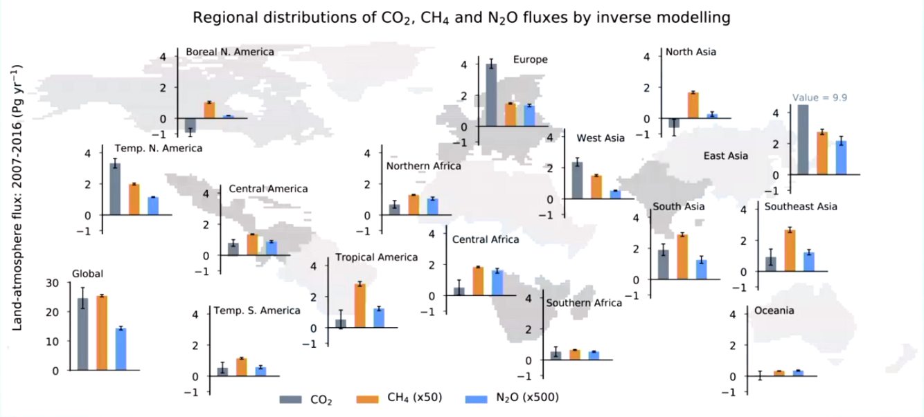 The net fluxes of carbon dioxide, methane and nitrogen oxide are all equal