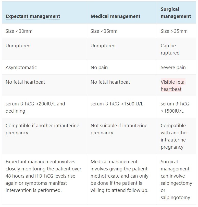 What are the 3 types of management for an ectopic pregnancy and what are the indications for each?
