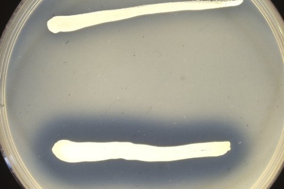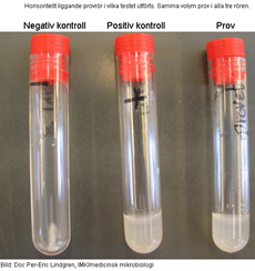 • Utspädd HCl hälles på plattan, ses klar zon närmast kolonierna eller stryket och en utfällning på resten av plattan är det positivt.