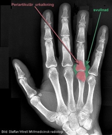 Vätska och inflammationsceller ansamlas i synovium och skapar en förtjockad synovialvävnad