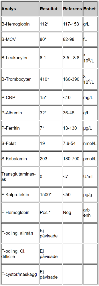 Linda, 21 år, återkommande buksmärtor. Omväxlande hård och lös i magen. Röker 2-3 cigaretter per dag. Stressad på grund av tentaångest. Avföringen på slutet mer lös än vanligt och slemmig men inget blod. Mamman har rematoid artrit och hypertoni. Pappan dog i coloncancer 52 år gammal.