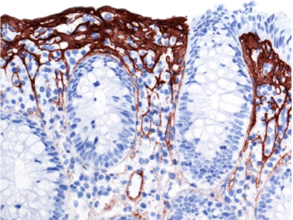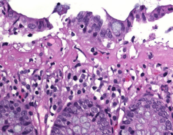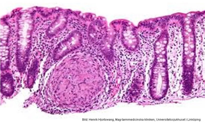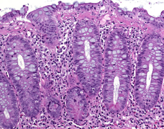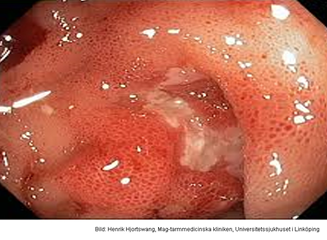 Rektum, sigmoideum, descendens, transversum och sista delen av ascendens är makroskopiskt normala. I första delen av ascendens och cekum är slemhinnan kraftigt inflammerad och har ett närmast gatstensliknande mönster. Slemhinnan i sista delen av ileum (bilden) är rodnad, svullen och lättblödande med talrika petekier. Det finns dessutom ett fibrinbelagt sår, ca 0.5 x 1.5 cm. Efter cirka 10 centimeter in i ileum är slemhinnan normal