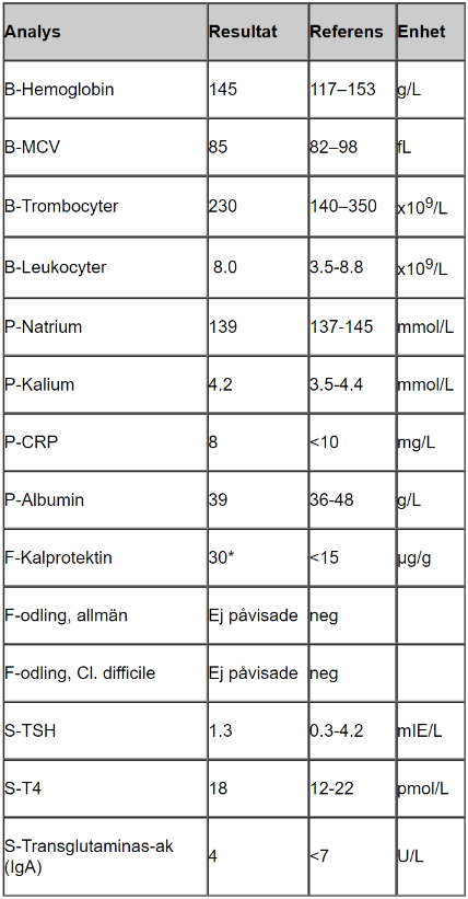 Lättare buksmärtor, diffusa och molande och kan komma när som helst. Gått ner 3,5 kg i vikt men hon vet inte om det beror på den vattniga diarrén eller pga. att hon har ätit mindre för att hålla diarrén i schack. Sen symptomstart också trötthet som är svårförklarad.