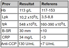 Etina söker nu vårdcentralen pga. uttalad värk och ömhet i höger fots MTP-led V. Besvären började för c:a 2 veckor sedan. Hon har provat värktabletter (paracetamol), men tycker inte att det hjälpt nämnvärt. Sedan tonåren röker hon ca 10-15 cigaretter om dagen och tar gärna ett glas vin till middagen. Fysisk aktivitet inskränker sig till promenader då och då.