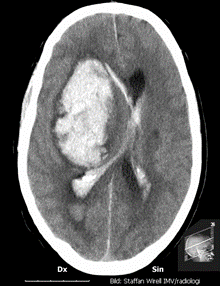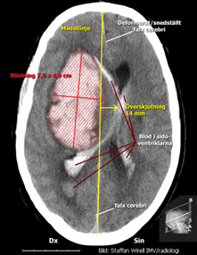 På akutmottagningen tar neurologjouren emot och bestämmer sig relativt omgående för att göra en akut datortomografi av hjärnan. Under väntetiden blir Hjalmar allt mer motoriskt orolig och oklar. Narkosläkare tillkallas och man tvingas söva och intubera patienten för att kunna genomföra röntgenundersökningen. Neurologjouren meddelas röntgensvaret och tillkallar omgående neurokirurgjouren. Då hon ser patienten på akuten är han sövd men nu är höger pupill större än vänster och de drar endast ihop sig trögt och ytterst lite då man lyser i dem. Patientens puls har börjat sjunka och är nu nere på 40/min. Hon beslutar om utrymning av hematomet och Hjalmar förs omedelbart till operationssalen. Under transporten dit får han intravenöst Mannitol och hyperventileras.