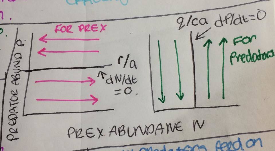 N= prey number and exponential growth dN/dt=rN p= predator number * more p = more N eaten *more N = more food for P = eat more * N should be hurt proportionally to both N and P