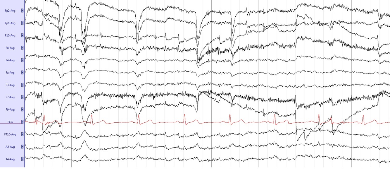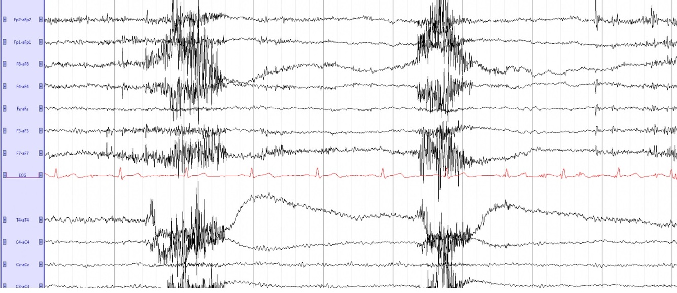 Diffuse bursts of fast myogenic artifact; hypoglossal artifact is diffuse and slow, synchronized activity