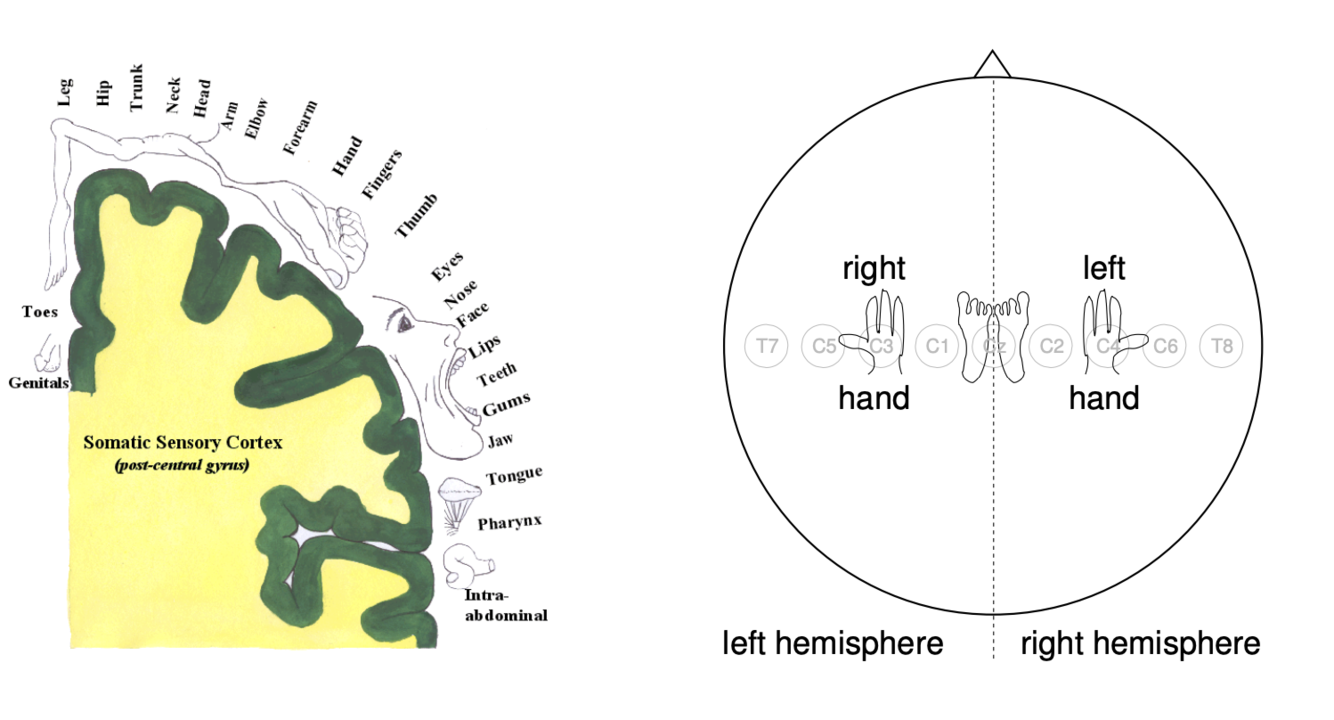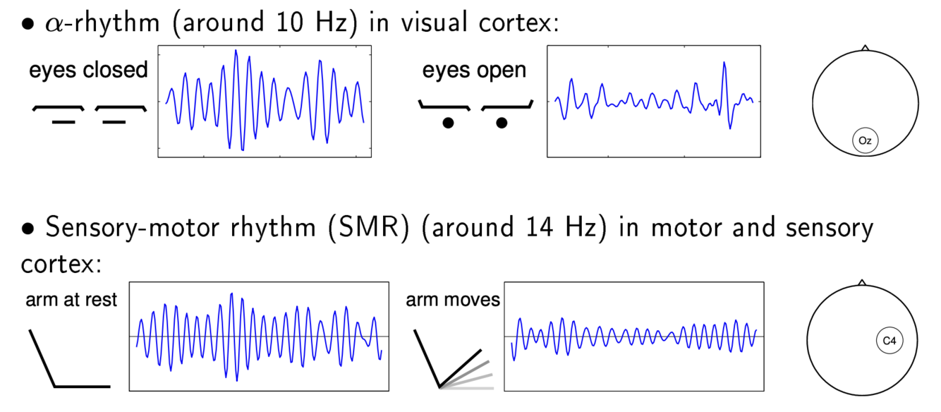 E.g. sensorimotor rhythm (SMR) which is a rhythm observed in the sensorimotor area. Here, the amplitude of SMR decreases when participants activate the body part represented by the corresponding brain area (Or even just imagines activating the body part).
