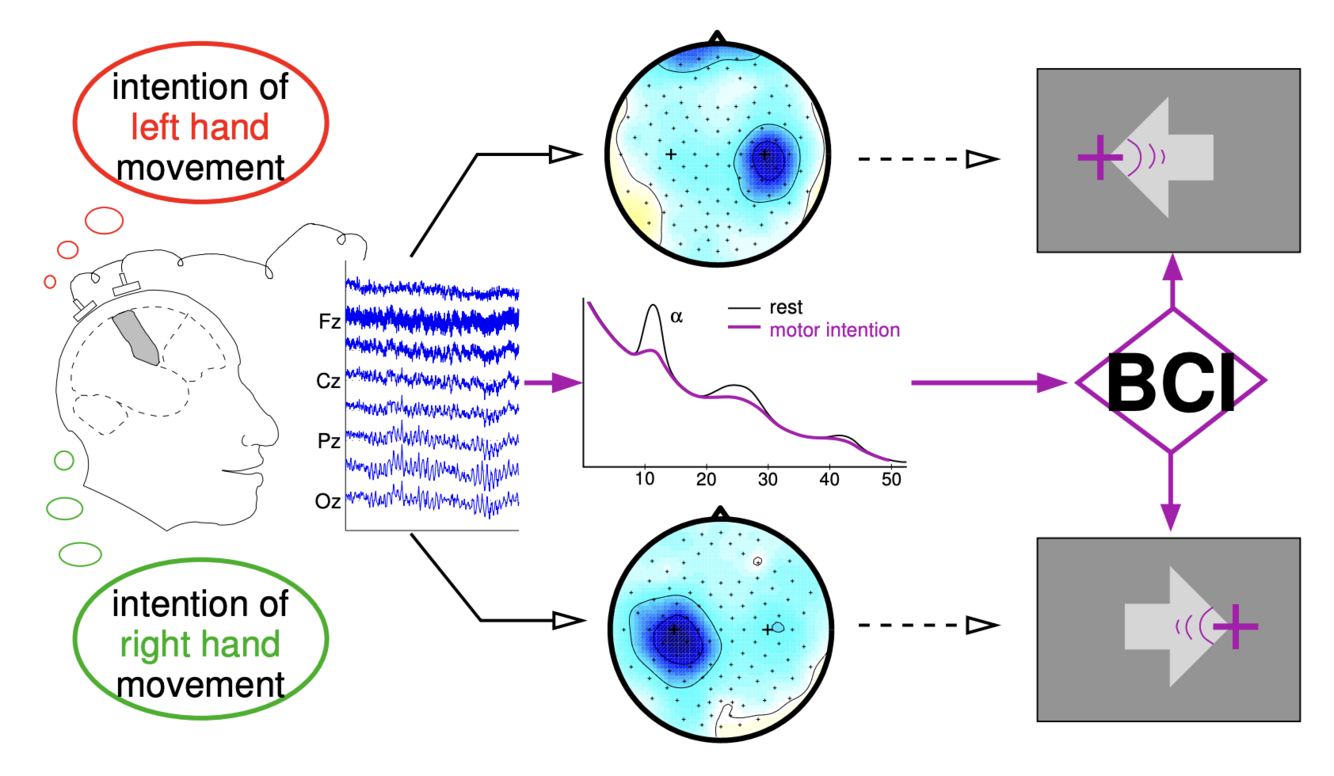 Paralysed participant is imagining moving either right or left hand. The EEG data is immediately analysed to determine whether there is left or right activation, and this is used to move a cursor in the desired direction.