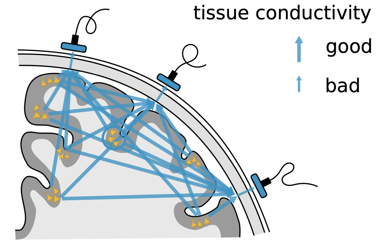 What problem arises due to differences in tissue conductivity of skull and cortex?
