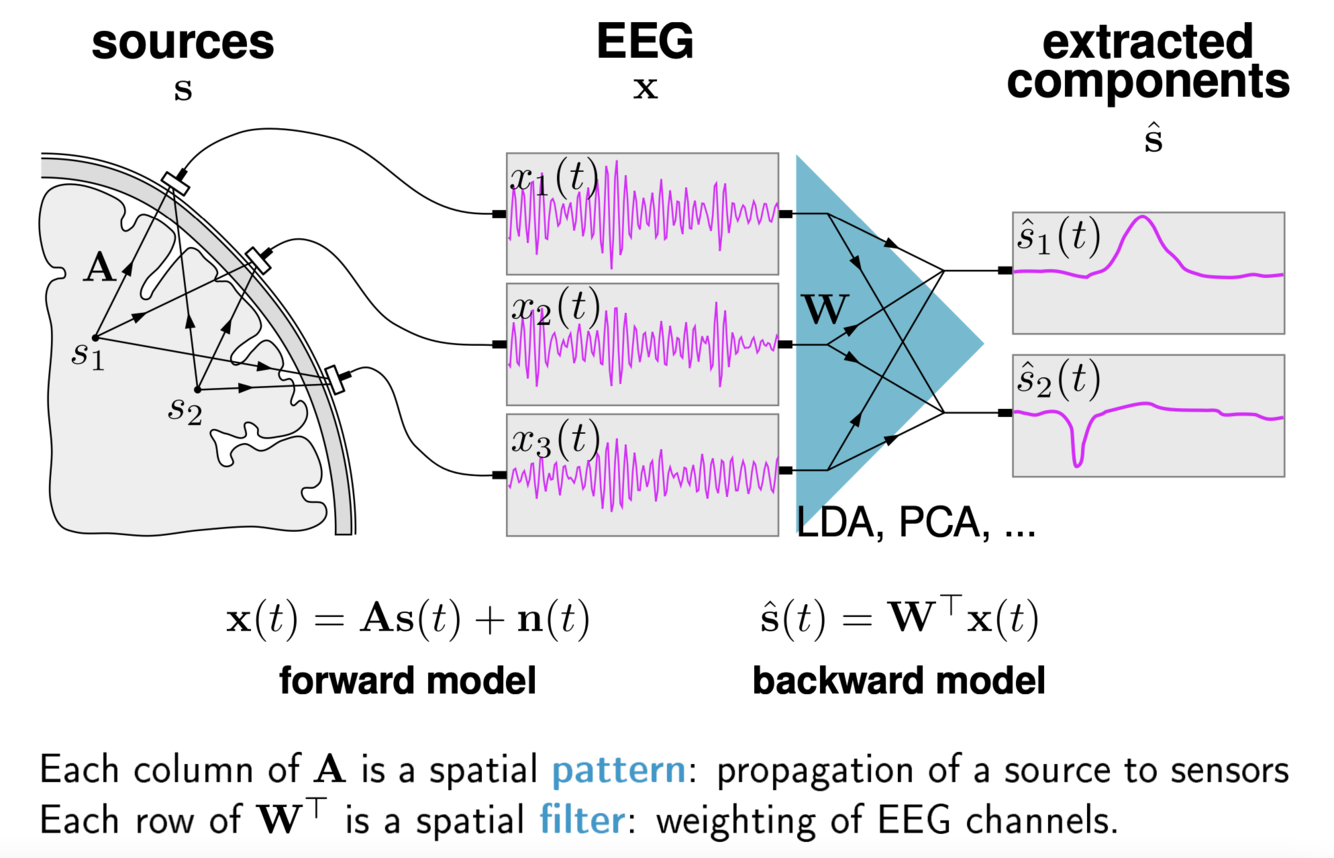 Thereafter, a backward model is used to de-mix the signals, so that the output reflects the activation at the source. The backward is typically some form of ML-model, such as LDA or PCA.