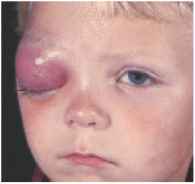 Usually occurs in children <3yrs. No ptosis or opthalmoplegia. Associated w/skin lesion or trauma. Caused by s. aureus or group A strep