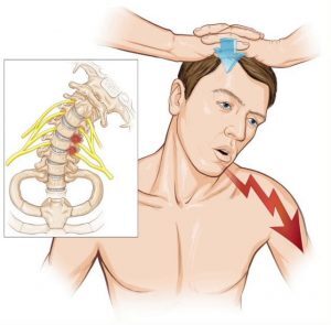 paciente coloca ativamente a mão no topo do crânio, provocando melhora da dor, sugerindo compressão ipsilateral em C5-C6