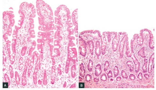 Picture A shows a normal biopsy from a healthy individual and Picture B shows the results of the biopsy from this patient.