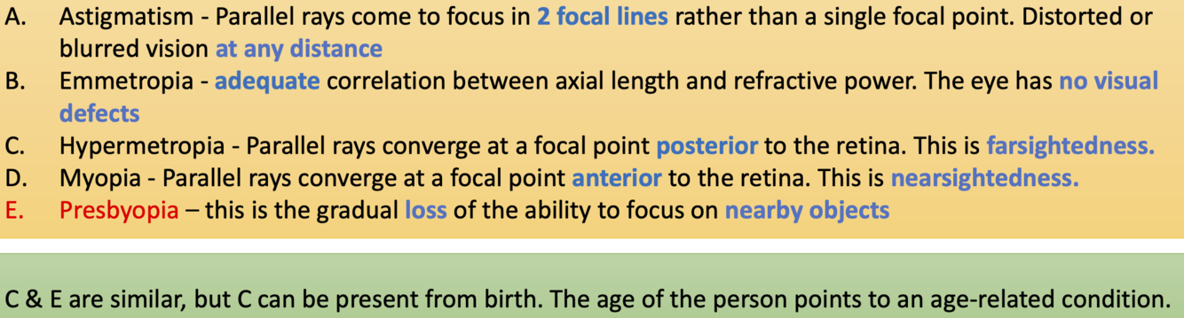 E. Presbyopia – this is the gradual loss of the ability to focus on nearby objects