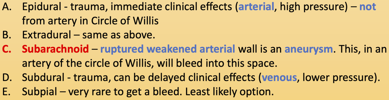 Subarachnoid – ruptured weakened arterial wall is an aneurysm. This, in an artery of the circle of Willis, will bleed into this space.