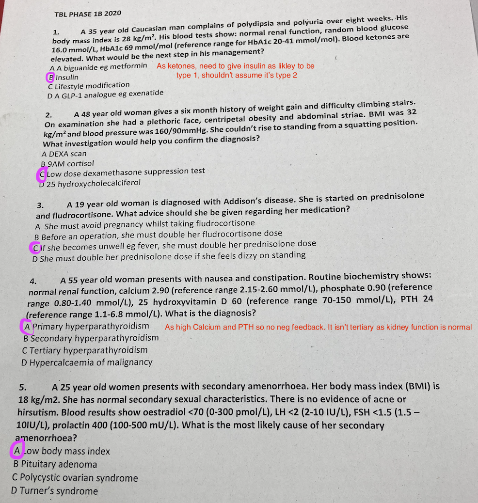 Diagnosis is Addison’s disease (primary adrenocortical failure) – autoimmune is the most common cause, so the previous diagnosis of primary hypothyroidism is a clue (primary hypothyroidism is most commonly also autoimmune and autoimmune diseases often cluster together in a patient, so a patient with one autoimmune disease is at increased risk of another autoimmune disease). The thyroid function tests are normal, so no need to adjust the thyroxine dose. The clues that this is Addison’s are: weight loss and dizziness (secondary to postural hypotension, due to the lack of aldosterone). The combination of a low serum sodium and a high serum potassium must always make you think of Addison’s (loss of aldosterone).