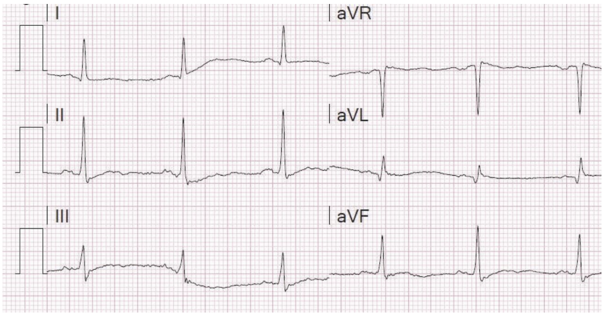 A 48 year old man reports a burning sensation in his chest. His electrocardiogram is shown below. Estimate his ventricular axis.