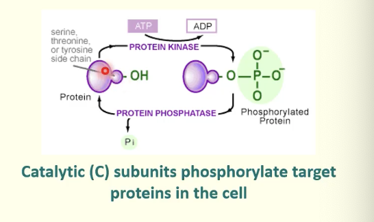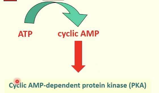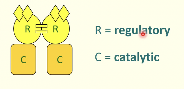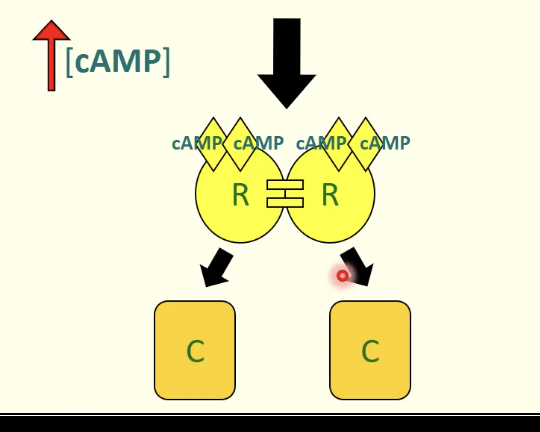 2) - When cAMP is high, it binds to R (regulatory) subunits on PKA