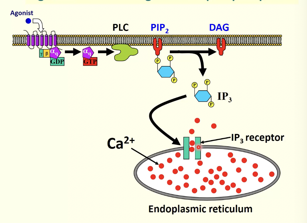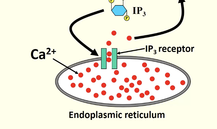 - Opens Ca2+ channels causing Ca2+ to be released into the cytoplasm down its conc. grad.