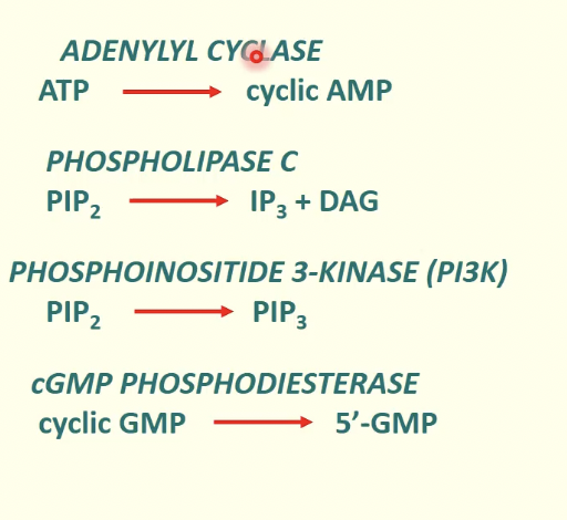 Give 4 examples of effectors that are enzymes, and name their second messengers