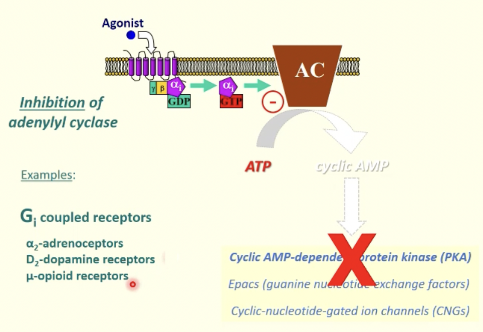 Describe how adenylyl cyclase is inhibited from producing cAMP (6)
