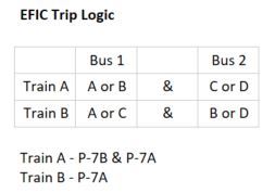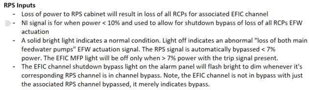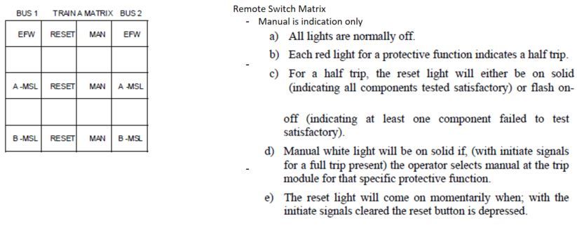 TWO signals are required to each trip module in order to produce a full trip of EFW (both trip busses energized). The status of these signals is indicated on the alarm panel “EXT TRIPS” ESAS lights. Two lights are on cabinet “A” for the signals from ESAS ch. 3 to the train “A” EFW trip module. Two lights are on cabinet “B” for the signals from ESAS ch. 4 to the train “B” EFW trip module.