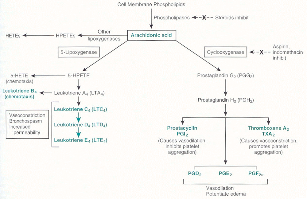 Phospholipids are cleaved from the membrane by phospholipase A2 and become Arachidonic acid COX-1 and COX-2 act to produce prostaglandins and thromboxane. Lipooxygenases act to produce leukotrienes.