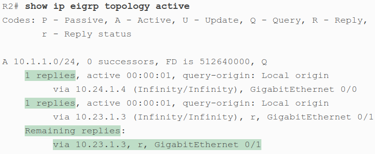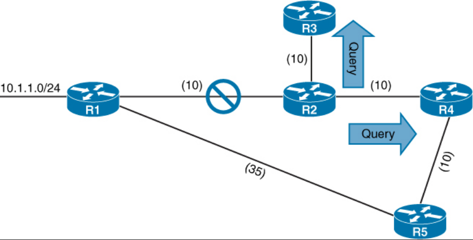 If a successor path is lost and no feasible successor is identified, the router goes active for that route. It sends out queries on all interfaces in an attempt to identify an alternative path. No successor can be chosen until the router receives a reply to all queries. If a neighbor does not reply within 3 minutes, the router becomes stuck in active (SIA). In that case, it resets the neighbor relationship with the neighbor that did not reply.