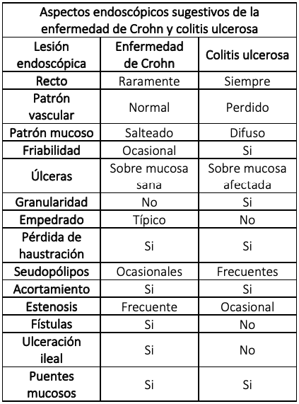Aspectos endoscopicos sugestivos de la enfermedad de Crohn y colitis ulcerosa (tabla comparativa):