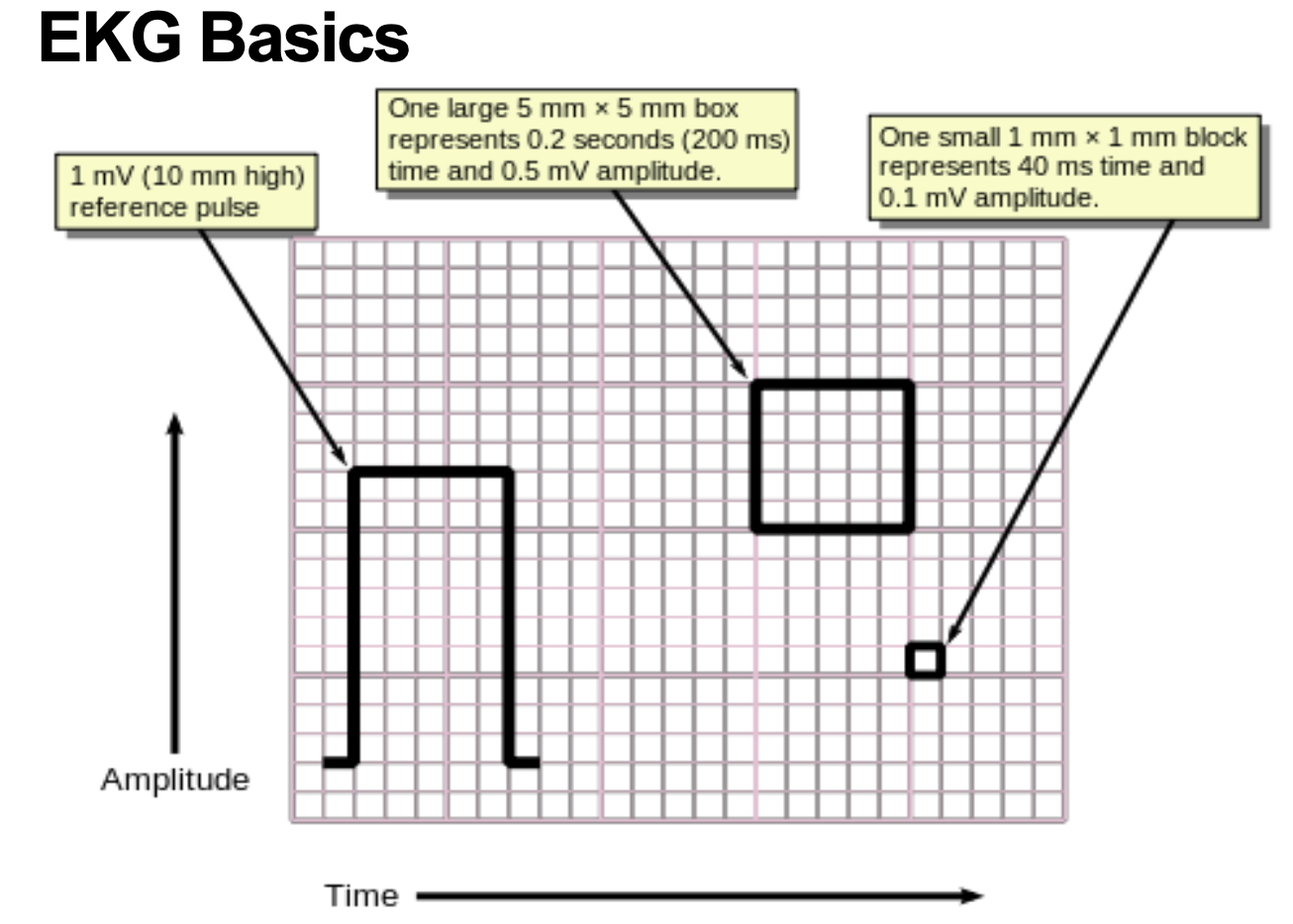 On an EKG readout, one large 5mm x 5mm box represents how much time & how much amplitude?