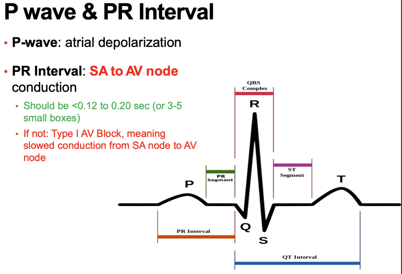 PR Interval: SA to AV node conduction.