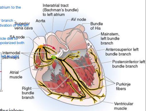 SA node → AV node → Bundle of His → Mainstem Left bundle branch → right bundle branch and Posterioinferior left bundle branch → Purkinje fibers