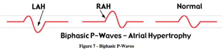 Atrial hypertrophy => biphasic P-wave, best seen in V1