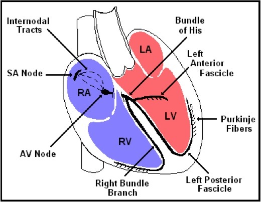 SA node, AV node, Bundle of His, Right & Left Bundle Branch, Purkinje Fibers