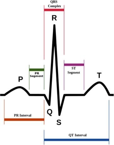 P wave, QRS complex, T wave