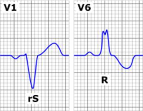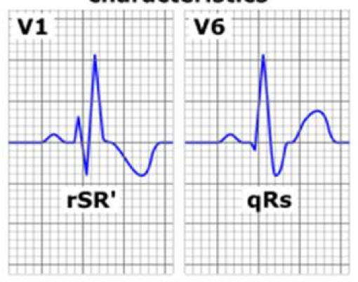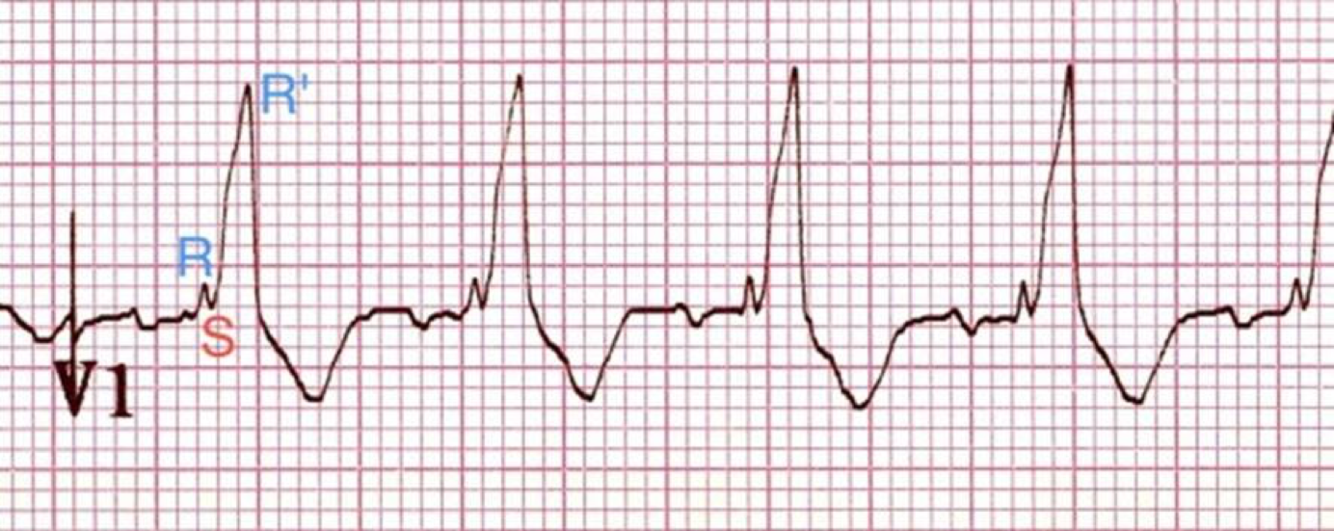 RBBB, R & R’, sharp peaks in V1-2